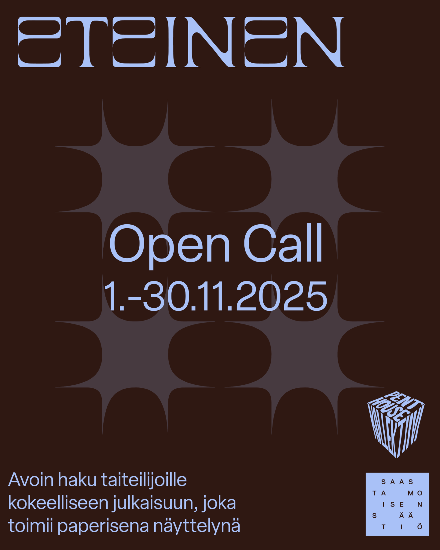 The publication Eteinen will be a physical magazine. The collective is seeking a wide range of artistic forms for the publication — including those not commonly seen in traditional print media. The layout and visual design will be experimental, breaking away from the conventional format of an art magazine. The purpose of the layout is to unite the featured works into a cohesive whole, while also functioning as an artwork in itself.