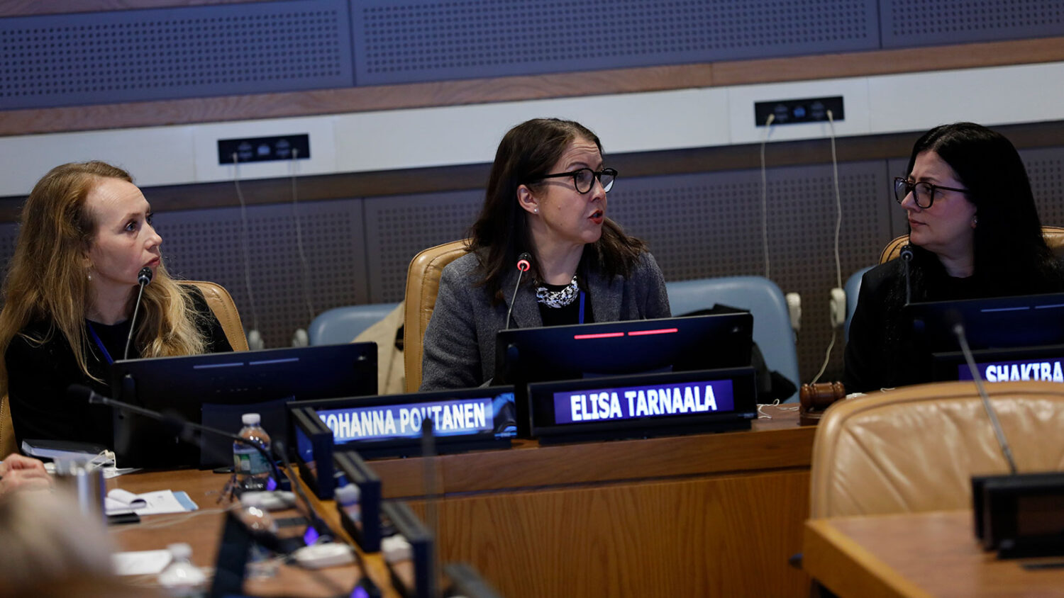 From the 1325 Anniversary Event: “The Secret Reading Club of Kabul: High-Level Dialogue Amplifying Voices of Afghan Women”. From the left: Johanna Poutanen, CMI, moderator Elisa Tarnaala, CMI, director Shakiba Adil. Photo: UN Women/Ryan Brown.