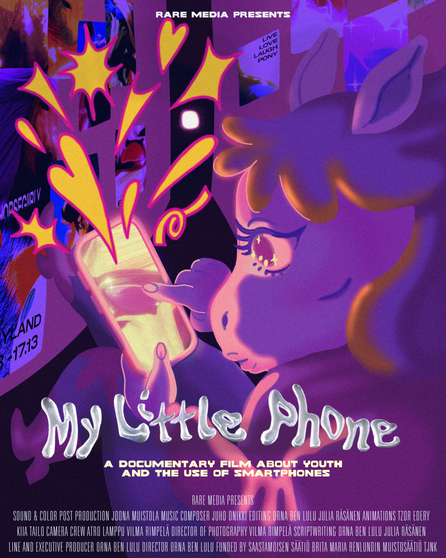 Dokumenttielokuvan kolmas päähenkilö eli puhelintaan selaava poni on pudonnut kaninkoloon tutkiessaan nuorten puhelimen käyttöä.